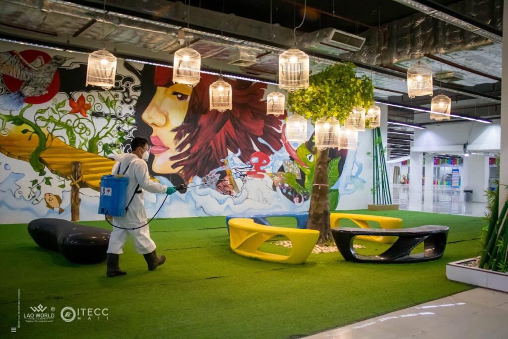 ໂດຍໄດ້ເອົາໃຈໃສ່ ໃນການພົ່ນຢາຂ້າເຊື້ອທັງ ດ້ານນອກ ແລະ ດ້ານໃນ ຂອງສູນການຄ້າ ໄດ້ເອົາໃຈໃສ່ທໍາຄວາມສະອາດ ທຸກຈຸດທີ່ມີຄວາມສ່ຽງທີ່ລູກຄ້າຕ້ອງສໍາພັດເຊັ່ນ: ຮາວຂັ້ນໄດເລື່ອນ, ລິບ, ຫ້ອງນໍ້າ, ທາງຍ່າງ ແລະ ຈຸດຕ່າງໆທີ່ມີຄວາມສ່ຽງ ດ້ວຍນໍ້າຢາຂ້າເຊື້ອທີ່ມີສ່ວນປະສົມຂອງທາດເຫຼົ້າ.