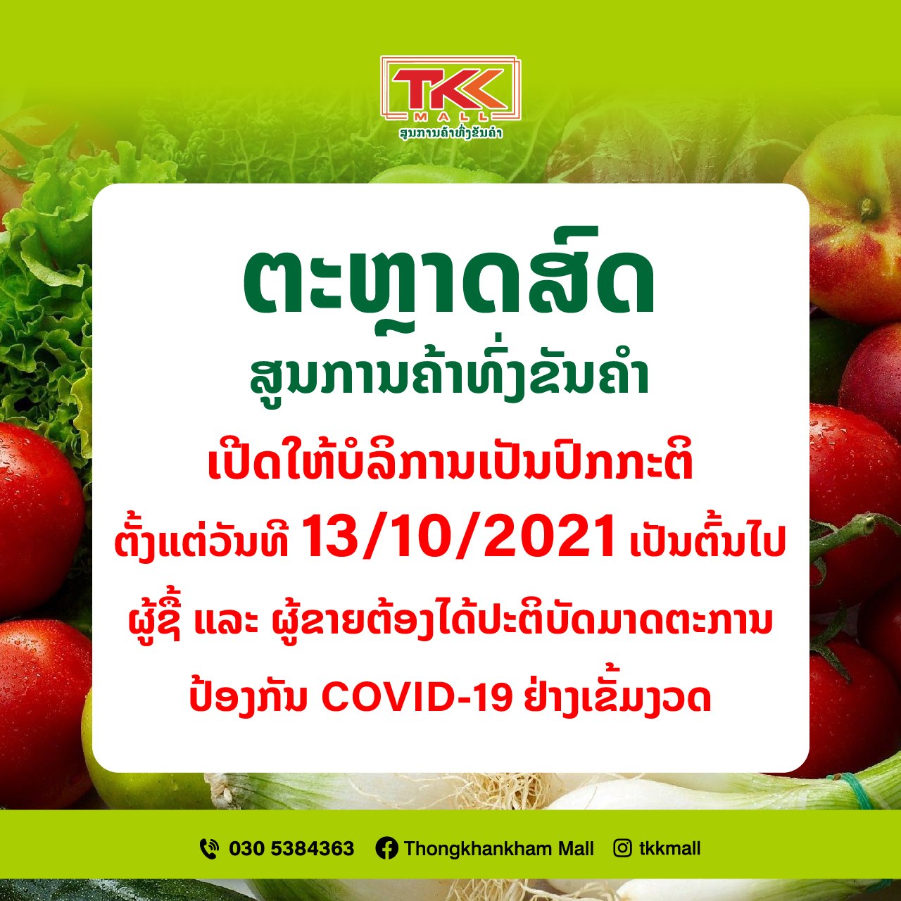 ຕະຫຼາດສົດ ສູນການຄ້າ ທົ່ງຂັນຄໍາ ຈະໄດ້ເປີດໃຫ້ບໍລິການເປັນປົກກະຕິ ນັບຕັ້ງແຕ່ ວັນທີ 13 ຕຸລາ 2021 ເປັນຕົ້ນໄປ ເວລາ 06:00 ຫາ 19:00 ໂມງ