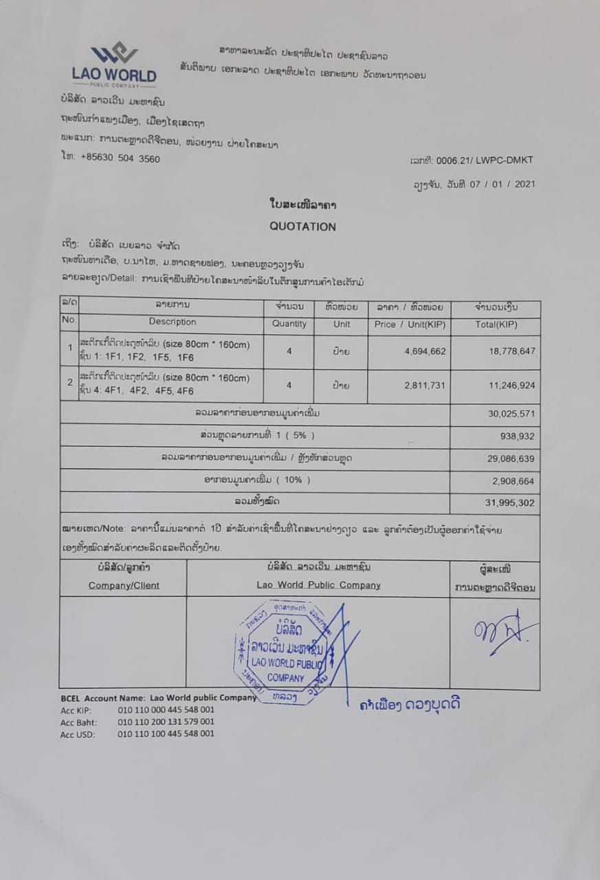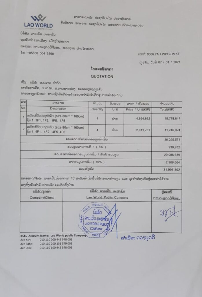 Advertising Media ITECC Mall Advertising ITM Elevator Door sticker (M-402) Advertising MediaITECC Mall Advertising ITM Elevator Door sticker (M-402) 06/01/2021 166 AD AVAILIBILITY PRICING VAT 10% Excluded Media Tax included Media & Installation Excluded SPECIFICATION Size: 90 x 210 cm (1.89 m2) MEDIA WITH INSTALLATION COST Media with installation Cost: 130,000 Kip/m2 Tax: 60,000 Kip/m2/Product/Year COST Structural cost: - N/A Total past income: 31,995,302 KIP Media and Inst. cost: xx% for the rent ANALYSIS Rental/m2 : N/A(From rental price) Rental/m2 : N/A (After Media costs) Media and Inst. cost: N/A% for the rent INSIGHT AD SPOT MAP $ 0 7F1 7F2 (FG) 7F3 7F4 7F5 (FG) 7F6 $ 0 7F7 (Closed) 7F8 (Closed) $ 0 6F1 (MJ) 6F2 (Ches) 6F3 6F4 6F5 (Ches) 6F6 (MJ) $ 0 6F7 (Ches) 6F8 $ 0 5F1 (Closed) 5F2 (Closed) 5F3 (Closed) 5F4 (Closed) 5F5 (Closed) 5F6 (Closed) $ 0 5F7 (Closed) 5F8 (Closed) $ 0 4F1 (BL) 4F2 (BL) 4F3 (MJ) 4F4 (MJ) 4F5 (BL) 4F6 (BL) $ 0 4F7 4F8 $ 0 3F1 3F2 (MJ) 3F3 (TKI) 3F4 (TKI) 3F5 (MJ) 3F6 $ 0 3F7 3F8 (Fit) $ 0 2F1 (FG) 2F2 (Ches) 2F3 (MJ) 2F4 (Ches) 2F5 (FG) 2F6 (MJ) $ 0 2F7 2F8 (Fit) $ 0 1F1 (BL) 1F2 (BL) 1F3 (TKI) 1F4 (TKI) 1F5 (BL) 1F6 (BL) $ 0 1F7 (FG) 1F8 (FG) $ 0 1B1 (FG) 1B2 1B3 (MJ) 1B4 (MJ) 1B5 1B6 (FG) $ 0 X1 (Ches) X2 (Ches) X3 (FG) X4 (Ches) X5 (FG) X6 (FG) $ 0 X7 (FG) X8 (FG) IMAGES DOCUMENTS