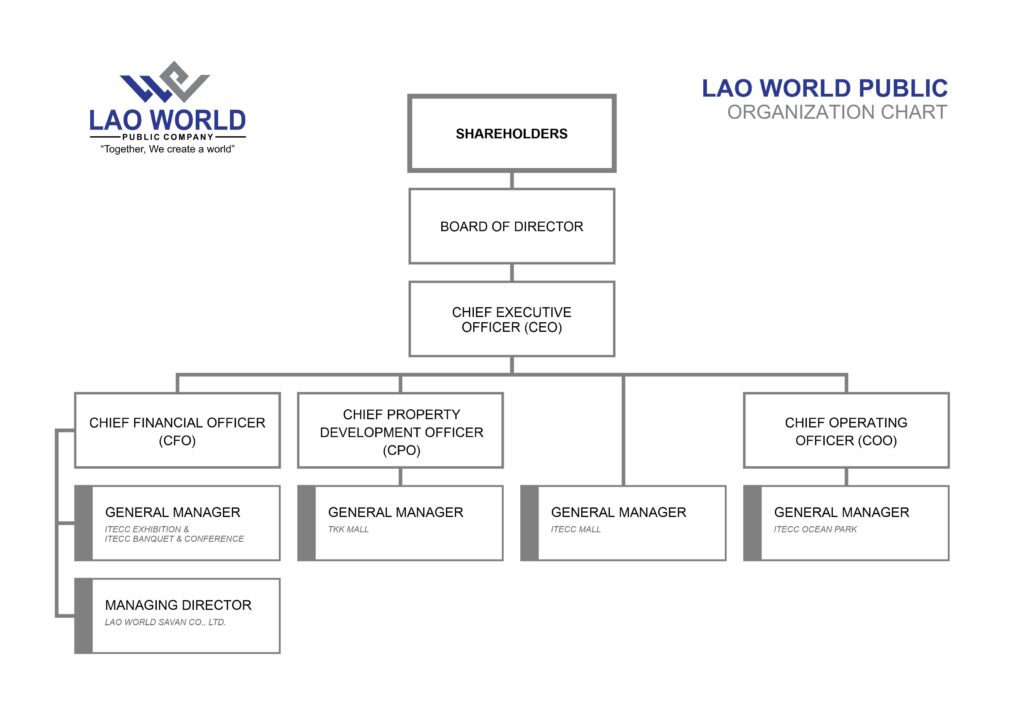 Lao World Public Company Limited has an organization chart. The management is divided into 4 sectors, with the Director and Deputy Director overseeing 5 business units, namely ITECC Mall, under the supervision of the CEO, ITECC Exhibition Center, ITECC Banquet & Conference Center and Savan ITECC Mall, Under the supervision of CFO, ITECC Ocean Park is under the supervision of COO and TKK Mall (Thongkhankham Mall) is under the supervision of CPO.